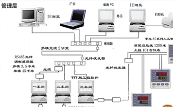 關(guān)鍵詞:光纜 監(jiān)控 以太網(wǎng)一、概述四川制藥股份有限公司在全廠局域網(wǎng)設(shè)計(jì)中采用光纖深入動(dòng)力車間兩臺喬納森公司550空壓機(jī)運(yùn)行情況控制,加入調(diào)度管理系統(tǒng),將以太網(wǎng)滲透到工業(yè)現(xiàn)場從而實(shí)現(xiàn)辦公自動(dòng)化與工業(yè)自動(dòng)化的無縫結(jié)合,給廠部調(diào)度室、總工隨時(shí)決策提供幫助。充分運(yùn)用AI系列智能儀表組建現(xiàn)場總線型計(jì)算機(jī)監(jiān)控系統(tǒng)連接到局域網(wǎng)上共享信息資源。使車間、調(diào)度室、廠辦計(jì)算機(jī)組成對等以太網(wǎng),實(shí)現(xiàn)資源共享管控一體化。二、系統(tǒng)架構(gòu)我們將傳統(tǒng)的服務(wù)器下放至現(xiàn)場充當(dāng)服務(wù)器,計(jì)算機(jī)中安裝WWW網(wǎng)絡(luò)版工控軟件,現(xiàn)場的儀表數(shù)據(jù)以數(shù)字信號的形式由服務(wù)器采集并保存于服務(wù)器中。 調(diào)節(jié)器AI-808AXL2L2S4巡檢儀AI-706MAJ0J0J0L2L2S AI表采集的壓力、流量、溫度、位移、液位、流量等數(shù)據(jù)存儲(chǔ)在客戶服務(wù)器WWW網(wǎng)絡(luò)版工控軟件數(shù)據(jù)庫,在計(jì)算機(jī)上按裝100M網(wǎng)卡,接上光纖收發(fā)器,通過四芯光纜送至500米(可達(dá)